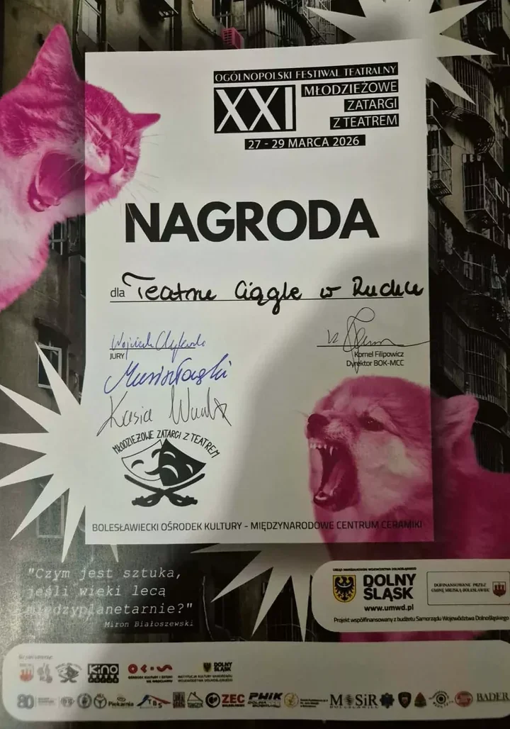Z Bolesławca do Krakowa płyną bardzo dobre wieści. Podczas XXI edycji Młodzieżowych Zatargów z Teatrem, która odbyła się w 27-29 marca 2026 roku w Bolesławieckim Ośrodku Kultury - Międzynarodowym Centrum Ceramiki, nagrodę zdobył Teatr Ciągle w Ruchu za spektakl „Bańka” w choreografii Marty Muck. 🎭