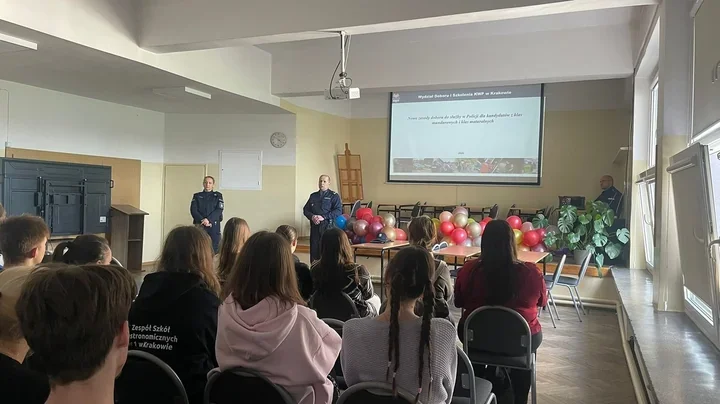 Na os. Złotej Jesieni policjanci z Komisariatu Policji VII w Krakowie spotkali się z uczniami Zespołu Szkół Gastronomicznych nr 1. Funkcjonariusze opowiadali nie tylko o codziennej pracy, ale też o tym, co daje służba w Policji - od wyzwań po stabilne zatrudnienie. Młodzież zadawała wiele pytań, a spotkanie szybko zamieniło się w żywą rozmowę o zawodzie.