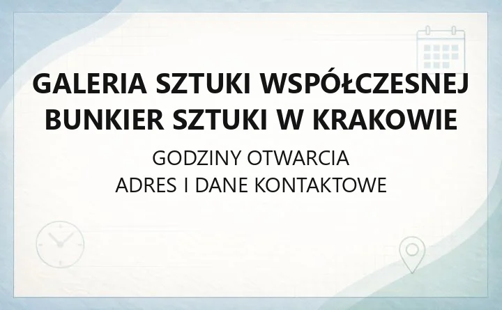 Galeria Sztuki Współczesnej Bunkier Sztuki (siedziba: pl. Szczepański 3a, 31-011 Kraków) prowadzi działalność wystawienniczą i edukacyjną z zakresu sztuki współczesnej. Poniżej znajdziesz praktyczne informacje: adresy i telefony, godziny zwiedzania, ceny biletów, zasady wizyty oraz procedury rezerwacji oprowadzania i warsztatów.