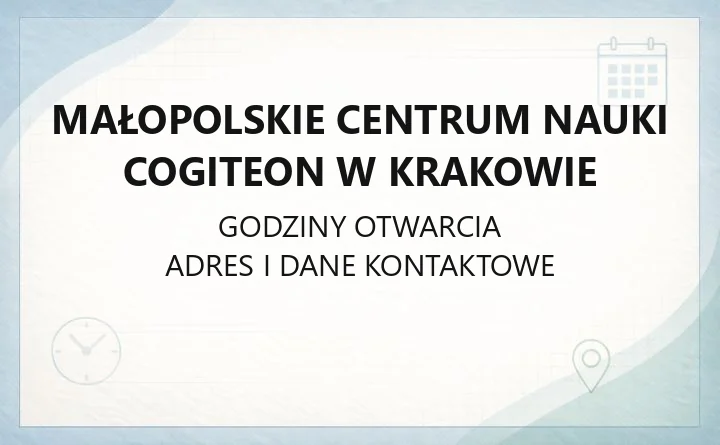 Małopolskie Centrum Nauki Cogiteon to interaktywne centrum nauki z wystawą stałą „Człowiek i jego marzenia”, laboratoriami, pracowniami, Akademią Dzieci oraz restauracją i kawiarnią. Poniżej znajdziesz praktyczne informacje: gdzie jest siedziba, jak dojechać, gdzie kupić bilety, jakie są stałe usługi edukacyjne oraz numery telefonów i godziny, pod którymi załatwisz konkretne sprawy.