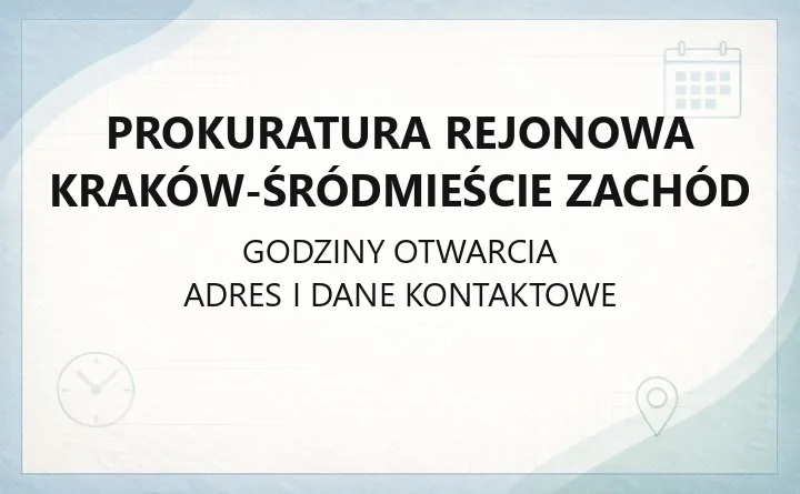 Prokuratura Rejonowa Kraków-Śródmieście Zachód mieści się przy ul. Mosiężniczej 2 w Krakowie. W artykule znajdziesz praktyczne informacje: gdzie złożyć zawiadomienie lub pismo, jakie są numery telefonów i godziny pracy biura podawczego oraz jak działa przyjęcie stron.